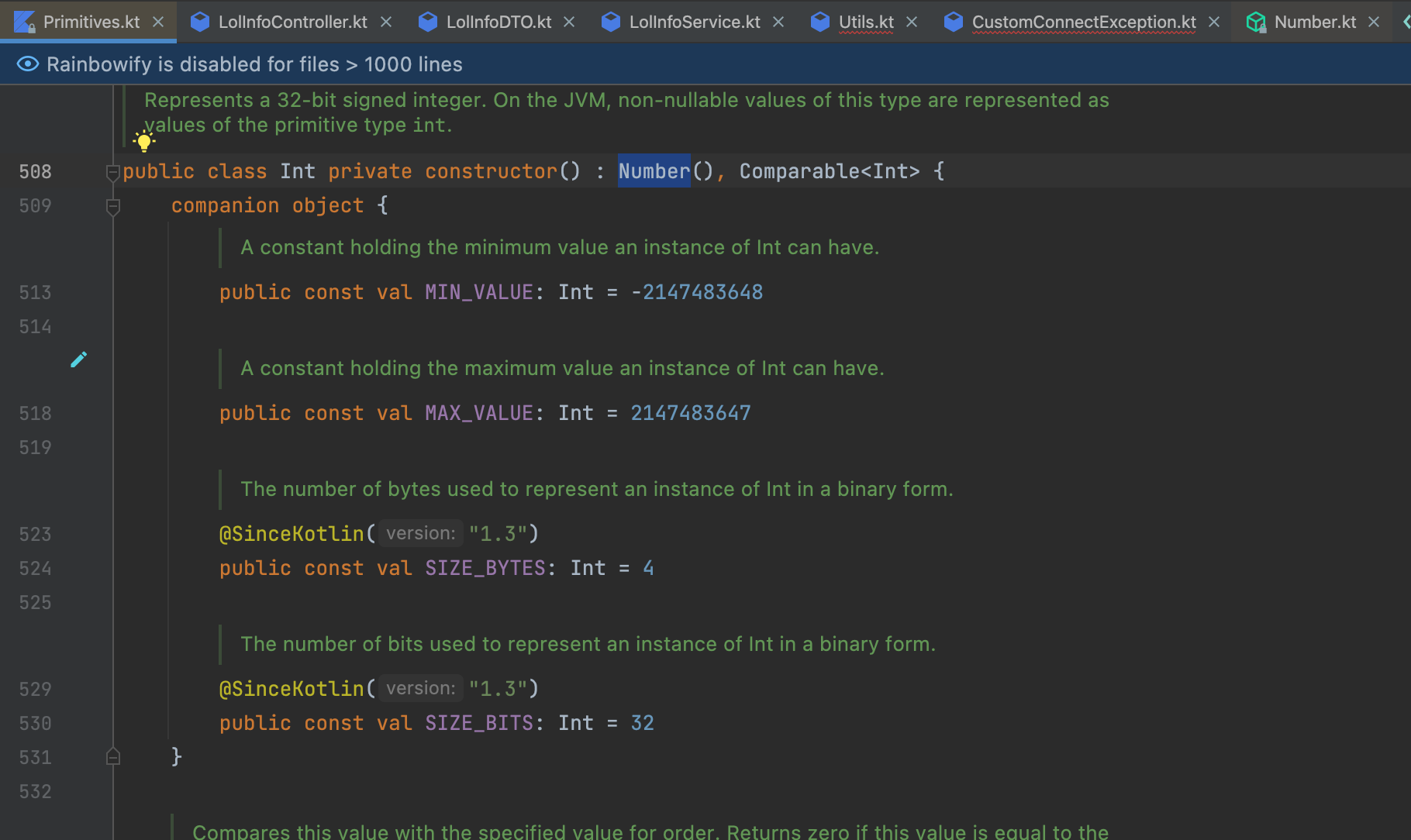 Int 타입을 확인하면 아래와 같이 Primitive.kt 파일에 정의가 되어있다.