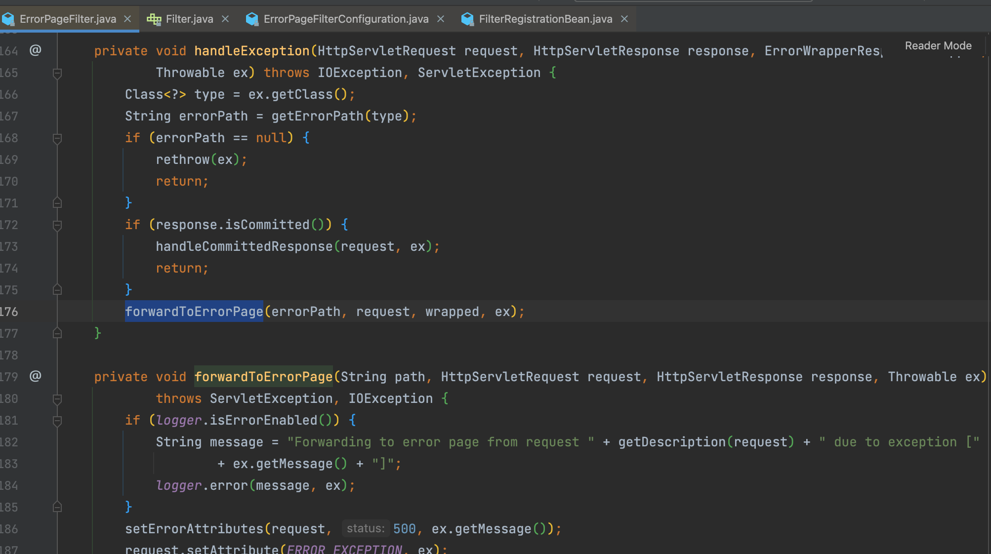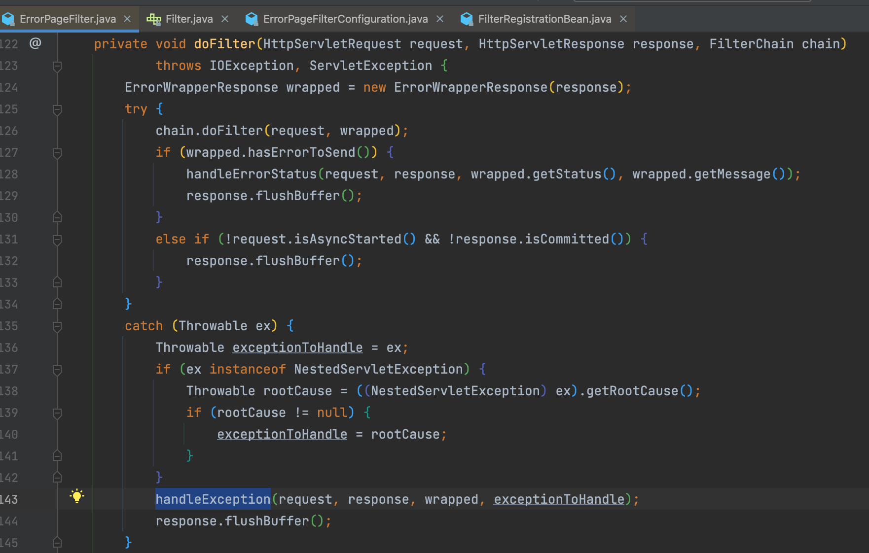 doFilter를 통해 필터링을 통해 request를 진행하다가 문제가 발생한다면(사용자가 핸들링 하지 못한 에러가 발생한다면) catch문을 통해 handleException을 호출하여 해당 에러를 핸들링하고 forwardToErrorPage를 호출하면서 기본적으로 500 status code를 반환하게 만들어 두었다.