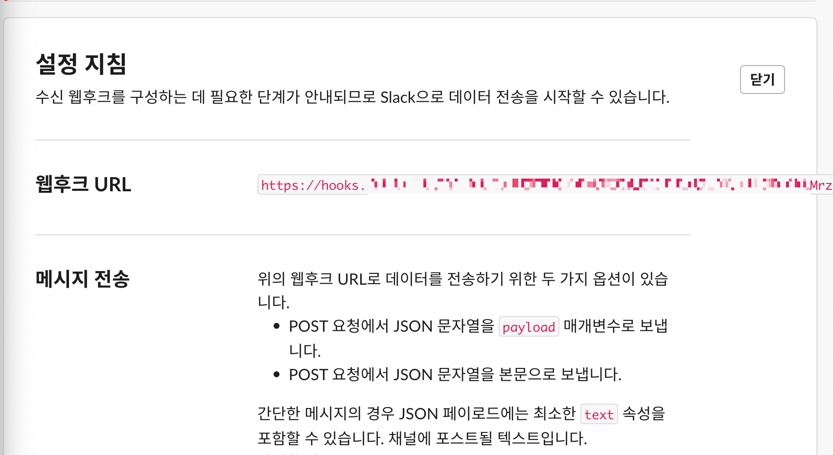 그러면 웹후크 URL이 나타나는데 이 URL로 우리는 요청을 보내 알람을 보내게 된다.