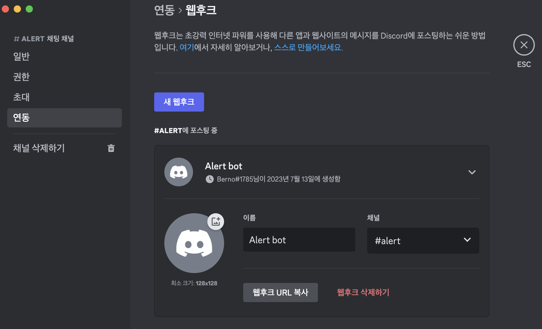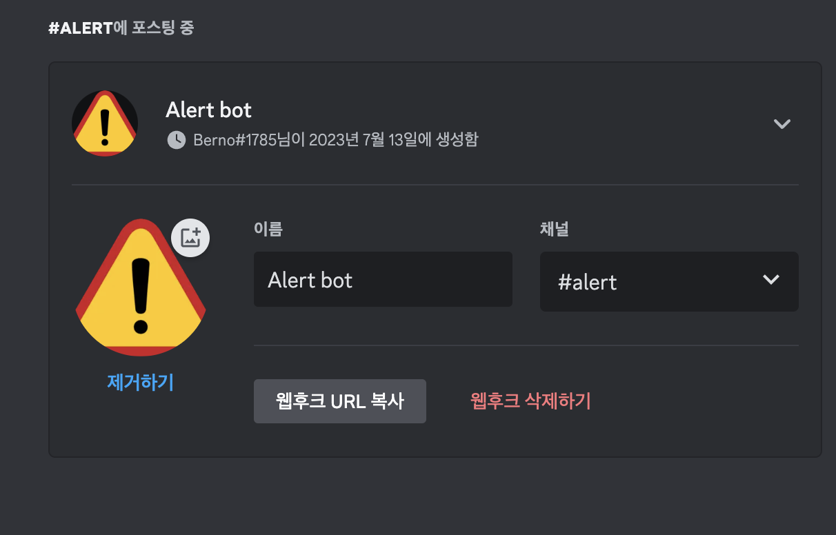 슬랙과는 다르게 외부로 노출되지 않으므로 웹후크 URL 복사 버튼을 잘 눌러서 사용하시기 바랍니다.