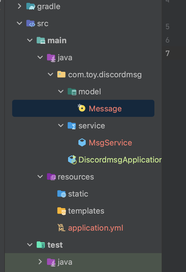 코드 구조는 심플하게 가져갑니다. 테스트 코드에서 끝낼 생각이며 Message를 담는 클래스 1개, 서비스 클래스 1개입니다.