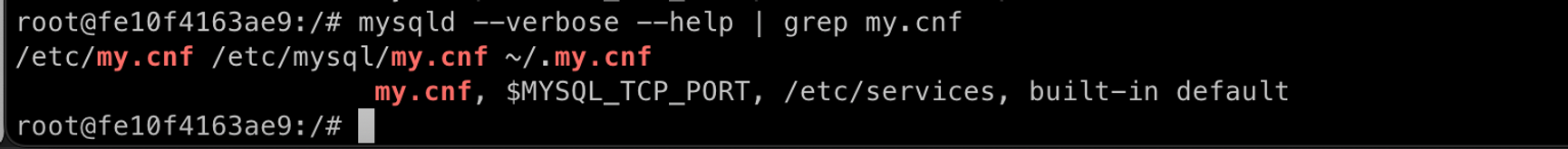 문제는 이 파일이 여러 경로에 존재할 수 있는데 어느 디렉토리에 있는 my.cnf를 참조하고 있는지 아래 명령어로 확인이 가능하다.