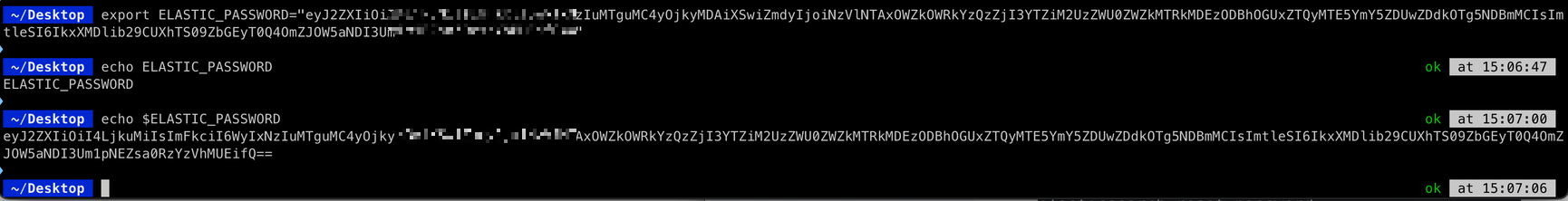 ~/Desktop/toy/elasticsearch curl -k -v --cacert ./http_ca.crt -u elastic:$ELASTIC_PASSWORD https://localhost:9200 ok at 15:23:21 * Trying 127.0.0.1:9200... * Connected to localhost (127.0.0.1) port 9200 (#0) * ALPN: offers h2 * ALPN: offers http/1.1 * (304) (OUT), TLS handshake, Client hello (1): * (304) (IN), TLS handshake, Server hello (2): * (304) (IN), TLS handshake, Unknown (8): * (304) (IN), TLS handshake, Certificate (11): * (304) (IN), TLS handshake, CERT verify (15): * (304) (IN), TLS handshake, Finished (20): * (304) (OUT), TLS handshake, Finished (20): * SSL connection using TLSv1.3 / AEAD-AES256-GCM-SHA384 * ALPN: server did not agree on a protocol. Uses default. * Server certificate: * subject: CN=de63c6ac1459 * start date: Sep 7 05:59:06 2023 GMT * expire date: Sep 6 05:59:06 2025 GMT * issuer: CN=Elasticsearch security auto-configuration HTTP CA * SSL certificate verify result: self signed certificate in certificate chain (19), continuing anyway. * Server auth using Basic with user 'elastic' > GET / HTTP/1.1 > Host: localhost:9200 > Authorization: Basic ZWxhc3RpYzpleUoyWlhJaU9pSTRMamt1TWlJc0ltRmtjaUk2V3lJeE56SXVNVGd1TUM0eU9qa3lNREFpWFN3aVptZHlJam9pTnpWbE5UQXhPV1prT1dSa1l6UXpaakkzWVRaaU0yVXpaV1UwWldaa01UUmtNREV6T0RCaE9HVXhaVFF5TVRFNVltWTVaRFV3WkRka09UZzVOREJtTUNJc0ltdGxlU0k2SWt4WE1EbGliMjlDVVhoVFMwOVpiR0V5VDBRNE9tWkpPVzVhTkRJM1VtMXBORVpzYTBSell6VmhNVUVpZlE9PQ== > User-Agent: curl/7.86.0 > Accept: */* > * Mark bundle as not supporting multiuse < HTTP/1.1 401 Unauthorized * Authentication problem. Ignoring this. < WWW-Authenticate: Basic realm="security" charset="UTF-8" < WWW-Authenticate: Bearer realm="security" < WWW-Authenticate: ApiKey < content-type: application/json < content-length: 465 < * Connection #0 to host localhost left intact {"error":{"root_cause":[{"type":"security_exception","reason":"unable to authenticate user [elastic] for REST request [/]","header":{"WWW-Authenticate":["Basic realm=\"security\" charset=\"UTF-8\"","Bearer realm=\"security\"","ApiKey"]}}],"type":"security_exception","reason":"unable to authenticate user [elastic] for REST request [/]","header":{"WWW-Authenticate":["Basic realm=\"security\" charset=\"UTF-8\"","Bearer realm=\"security\"","ApiKey"]}},"status":401}%