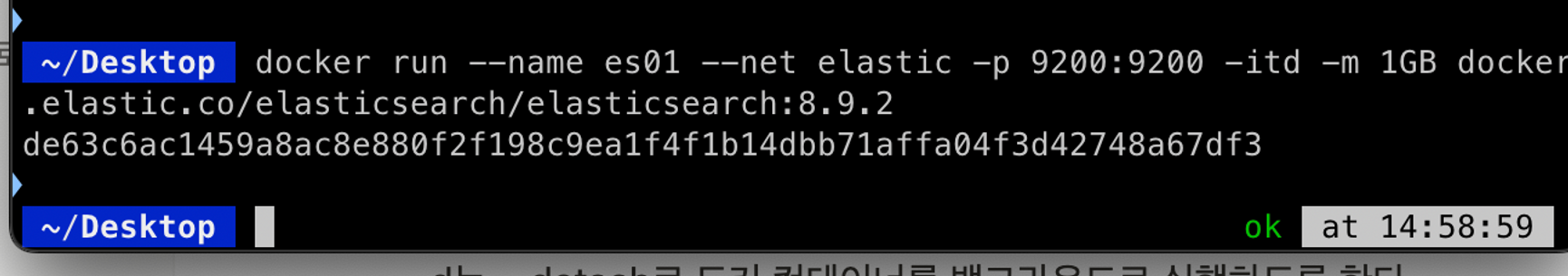 -d는 --detach로 도커 컨테이너를 백그라운드로 실행하도록 한다. 이 옵션을 실행하지 않으면 바로 도커 컨테이너 터미널(elasticsearch)로 전환되겠지만 이 옵션을 통해 백그라운드 실행으로 돌리고 다른 작업을 할 수 있다.