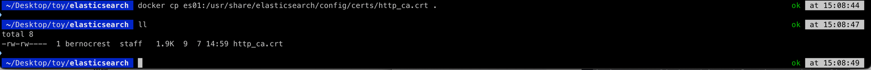 위에서는 es01컨테이너의/usr/share/elasticsearch/config/certs/http_ca.crt 파일을 현재 위치로 복사한다.