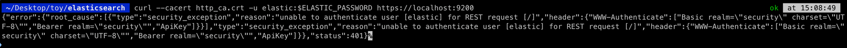 ~/Desktop/toy/elasticsearch curl -k -v --cacert ./http_ca.crt -u elastic:$ELASTIC_PASSWORD https://localhost:9200 ok at 15:23:21 * Trying 127.0.0.1:9200... * Connected to localhost (127.0.0.1) port 9200 (#0) * ALPN: offers h2 * ALPN: offers http/1.1 * (304) (OUT), TLS handshake, Client hello (1): * (304) (IN), TLS handshake, Server hello (2): * (304) (IN), TLS handshake, Unknown (8): * (304) (IN), TLS handshake, Certificate (11): * (304) (IN), TLS handshake, CERT verify (15): * (304) (IN), TLS handshake, Finished (20): * (304) (OUT), TLS handshake, Finished (20): * SSL connection using TLSv1.3 / AEAD-AES256-GCM-SHA384 * ALPN: server did not agree on a protocol. Uses default. * Server certificate: * subject: CN=de63c6ac1459 * start date: Sep 7 05:59:06 2023 GMT * expire date: Sep 6 05:59:06 2025 GMT * issuer: CN=Elasticsearch security auto-configuration HTTP CA * SSL certificate verify result: self signed certificate in certificate chain (19), continuing anyway. * Server auth using Basic with user 'elastic' > GET / HTTP/1.1 > Host: localhost:9200 > Authorization: Basic ZWxhc3RpYzpleUoyWlhJaU9pSTRMamt1TWlJc0ltRmtjaUk2V3lJeE56SXVNVGd1TUM0eU9qa3lNREFpWFN3aVptZHlJam9pTnpWbE5UQXhPV1prT1dSa1l6UXpaakkzWVRaaU0yVXpaV1UwWldaa01UUmtNREV6T0RCaE9HVXhaVFF5TVRFNVltWTVaRFV3WkRka09UZzVOREJtTUNJc0ltdGxlU0k2SWt4WE1EbGliMjlDVVhoVFMwOVpiR0V5VDBRNE9tWkpPVzVhTkRJM1VtMXBORVpzYTBSell6VmhNVUVpZlE9PQ== > User-Agent: curl/7.86.0 > Accept: */* > * Mark bundle as not supporting multiuse < HTTP/1.1 401 Unauthorized * Authentication problem. Ignoring this. < WWW-Authenticate: Basic realm="security" charset="UTF-8" < WWW-Authenticate: Bearer realm="security" < WWW-Authenticate: ApiKey < content-type: application/json < content-length: 465 < * Connection #0 to host localhost left intact {"error":{"root_cause":[{"type":"security_exception","reason":"unable to authenticate user [elastic] for REST request [/]","header":{"WWW-Authenticate":["Basic realm=\"security\" charset=\"UTF-8\"","Bearer realm=\"security\"","ApiKey"]}}],"type":"security_exception","reason":"unable to authenticate user [elastic] for REST request [/]","header":{"WWW-Authenticate":["Basic realm=\"security\" charset=\"UTF-8\"","Bearer realm=\"security\"","ApiKey"]}},"status":401}%