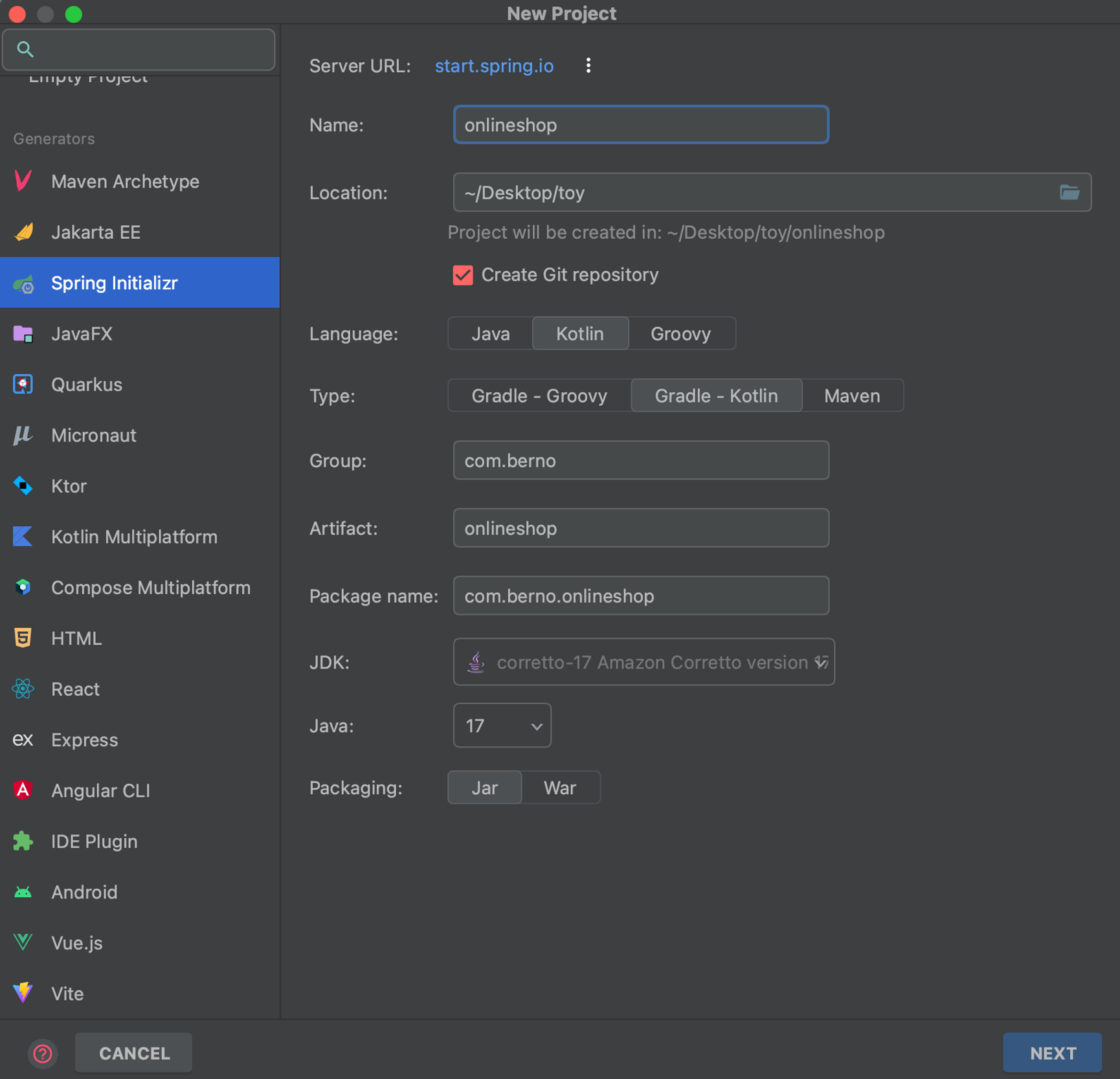 여기서 Language는 Kotlin, Type은 Gradle - Kotlin을 고른다.