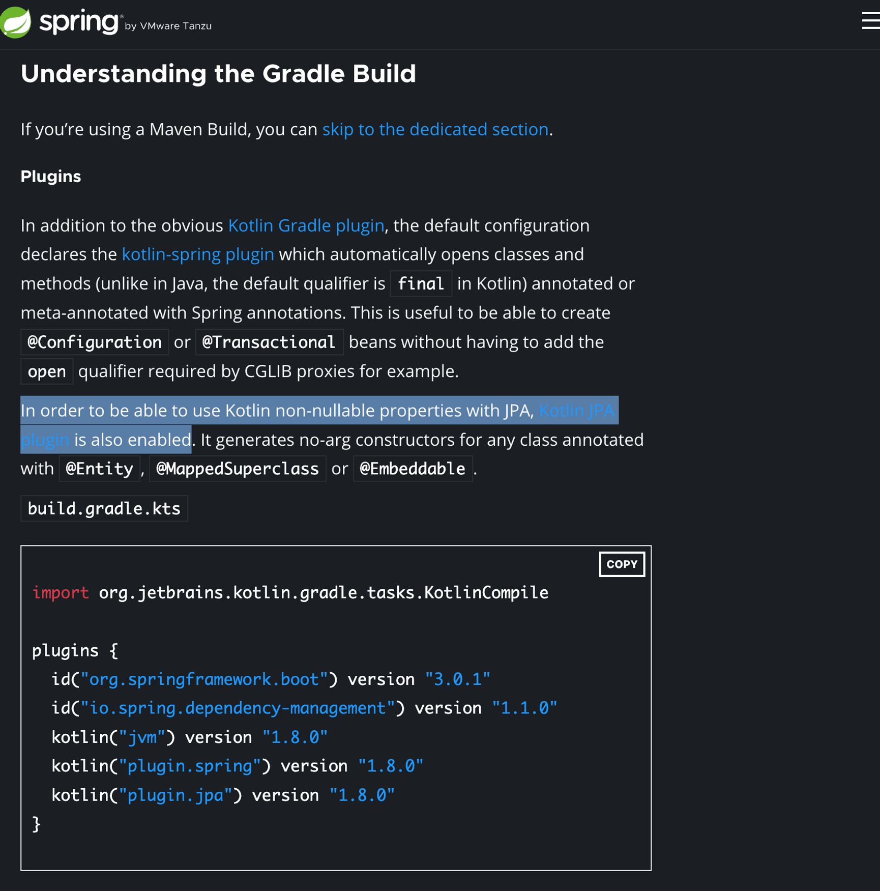 Java에서 추가하던 것 과는 다르게 Kotlin JPA Plugin을 추가해야 한다고 한다.