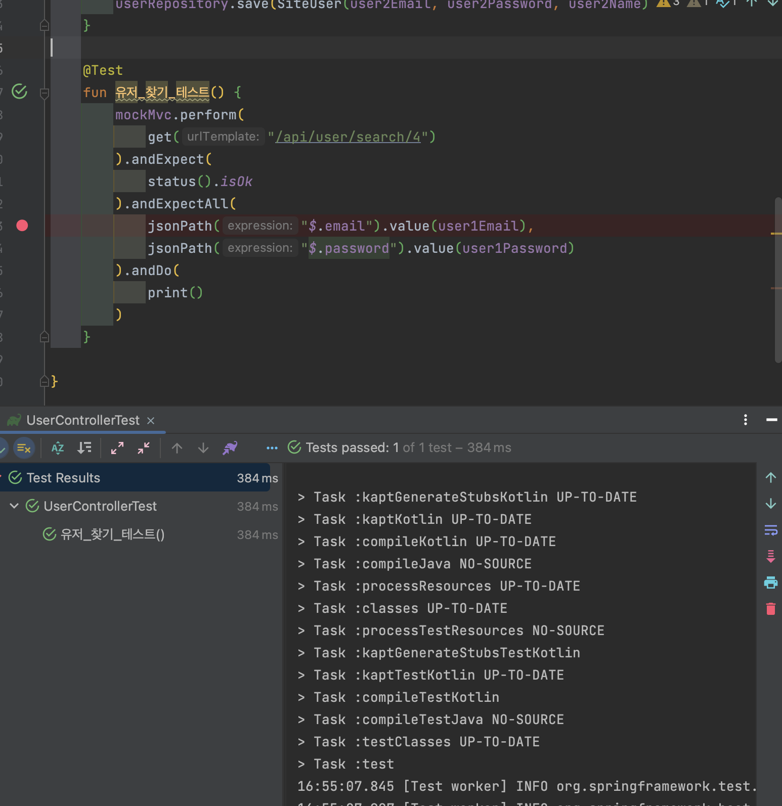 MockMvc를 이용해 컨트롤러 테스트를 진행했다.