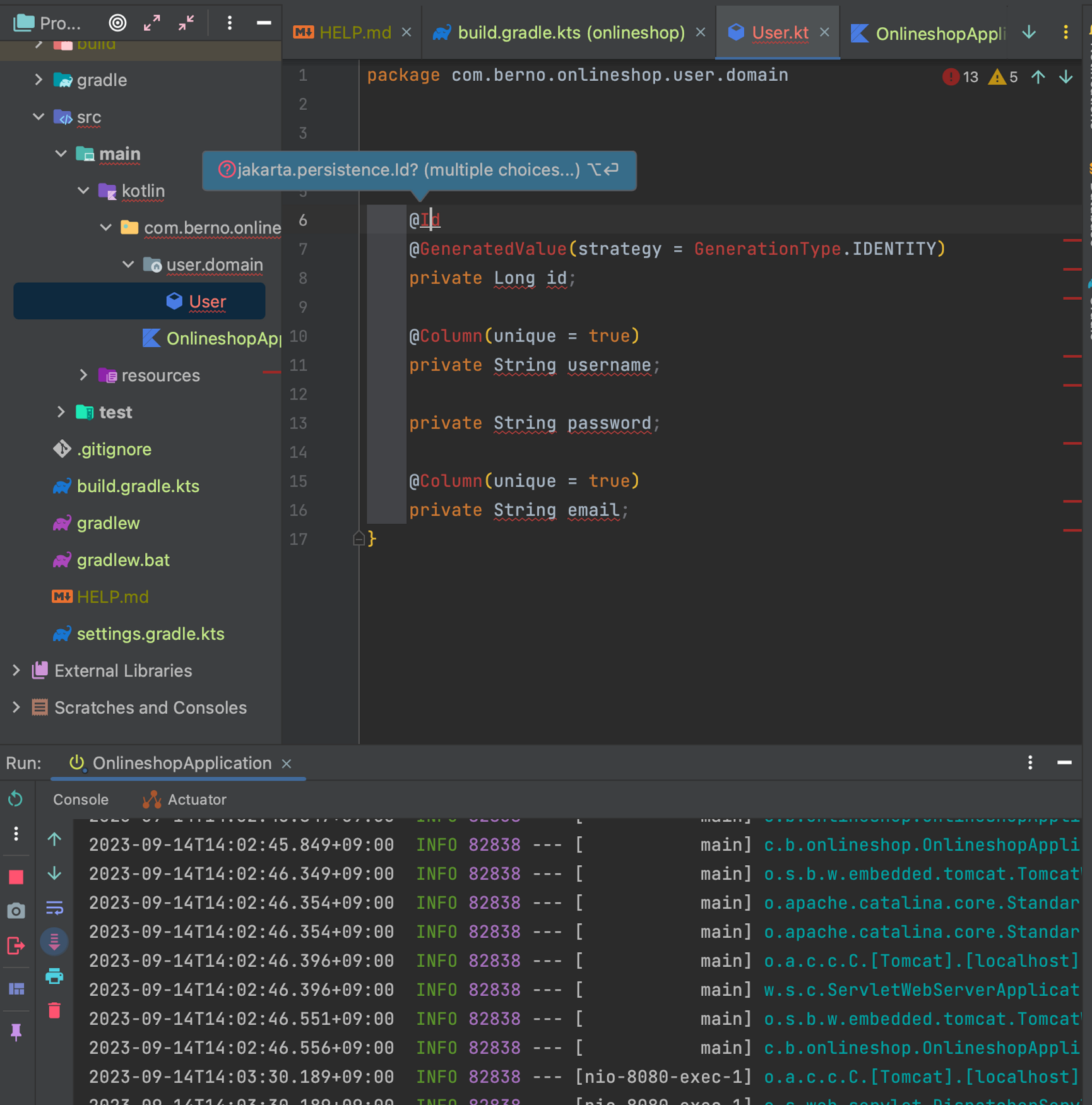 Kotlin에서는 클래스 선언부에서 소괄호()를 이용해 기본 생성자를 지정해 줄 수 있다. 이 부분에 Entity의 멤버에 대한 내용을 추가해 준다.