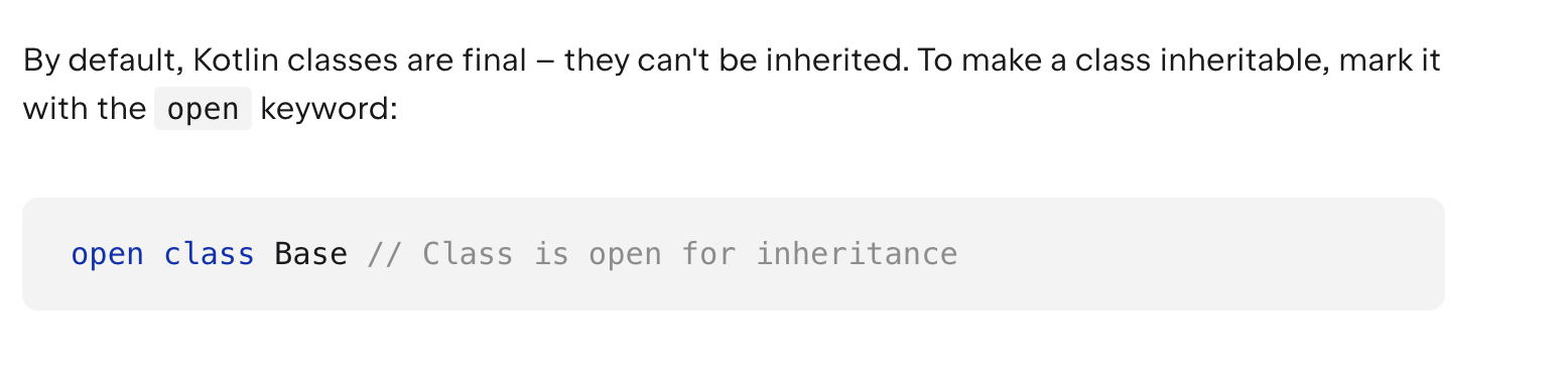 하지만 Kotlin에서는 그냥 생성하게 되면 기본적으로 final 키워드가 붙게 되어 상속이 불가능해진다.