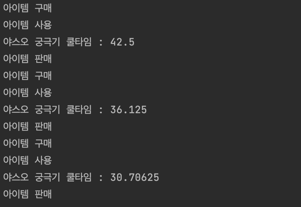 신규 아이템을 사용하면(원래는 가지고 있으면이지만 개발 편의를 위해 사용으로 바꿔보았다. 딱 한번 사용 가능하다고 해보자.) 궁극기 쿨타임이 줄어드는데 문제는 사용하고 상점에 팔고 다시 사고 사용하고 상점에 팔고 사고.. 반복하는 만큼 쿨타임이 계속 줄어드는 것