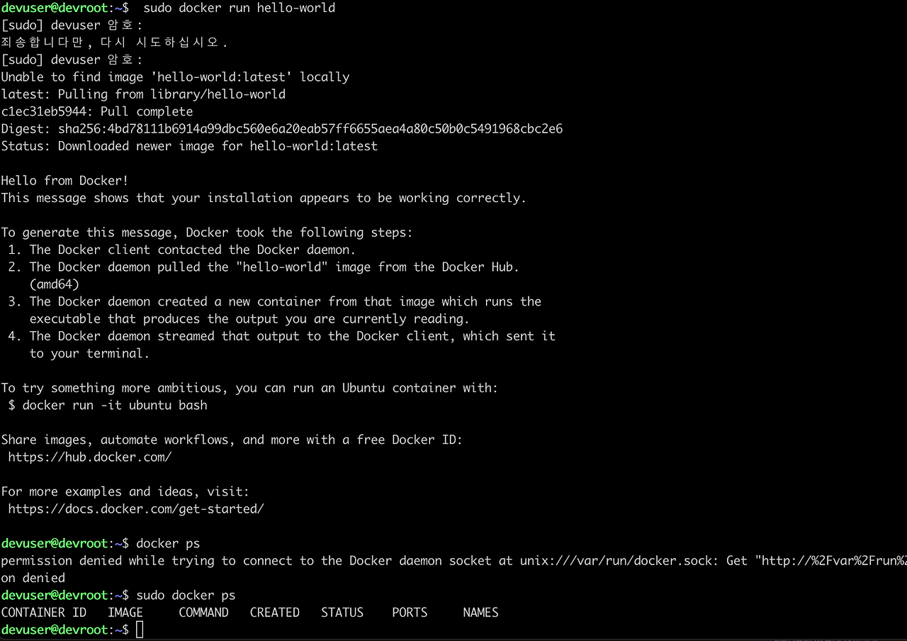 설치가 잘 되었는지 hello-world 컨테이너를 돌려보자.