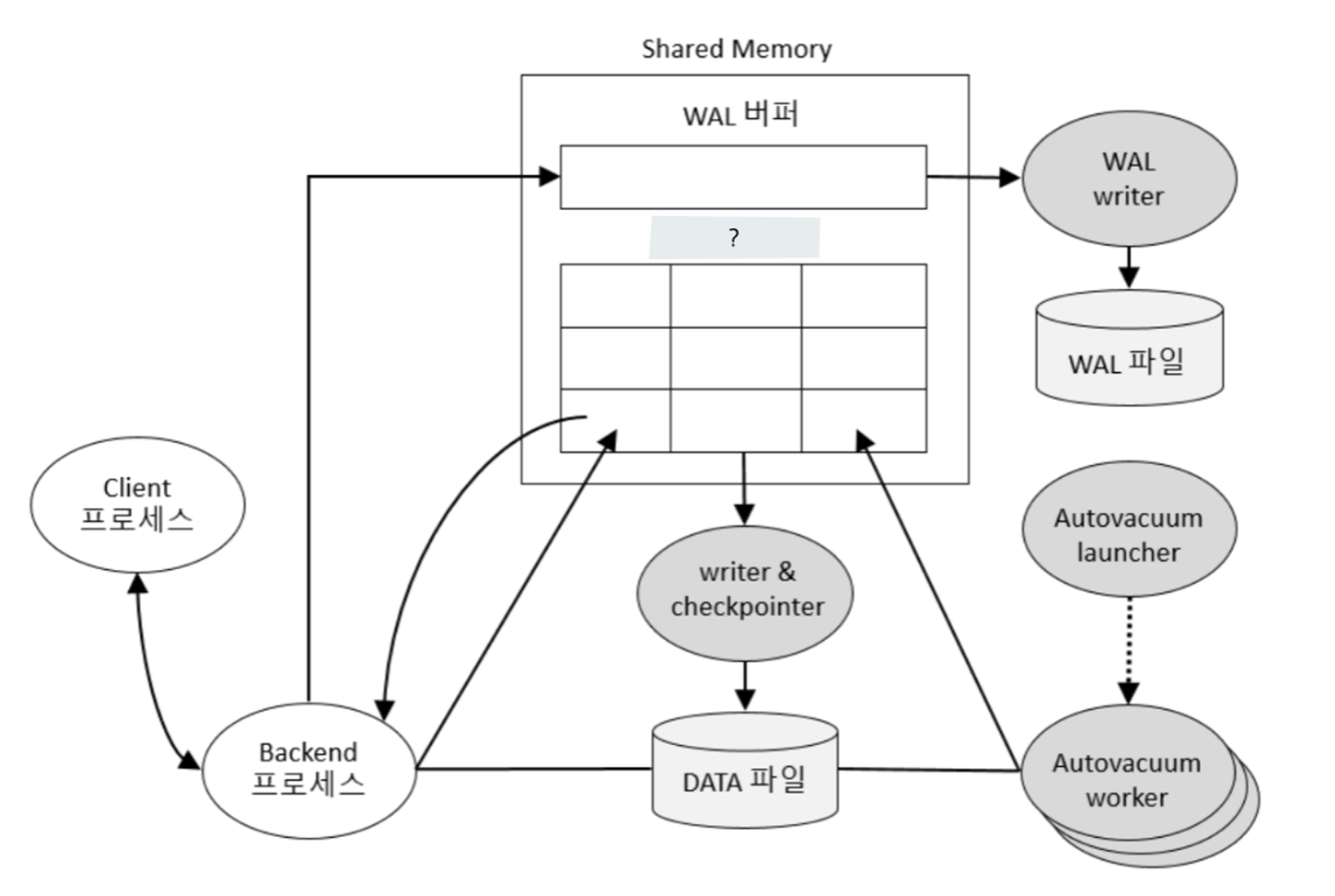 - 공유 메모리( Shared Buffer, WAL 버퍼 ), 프로세스, 데이터 파일