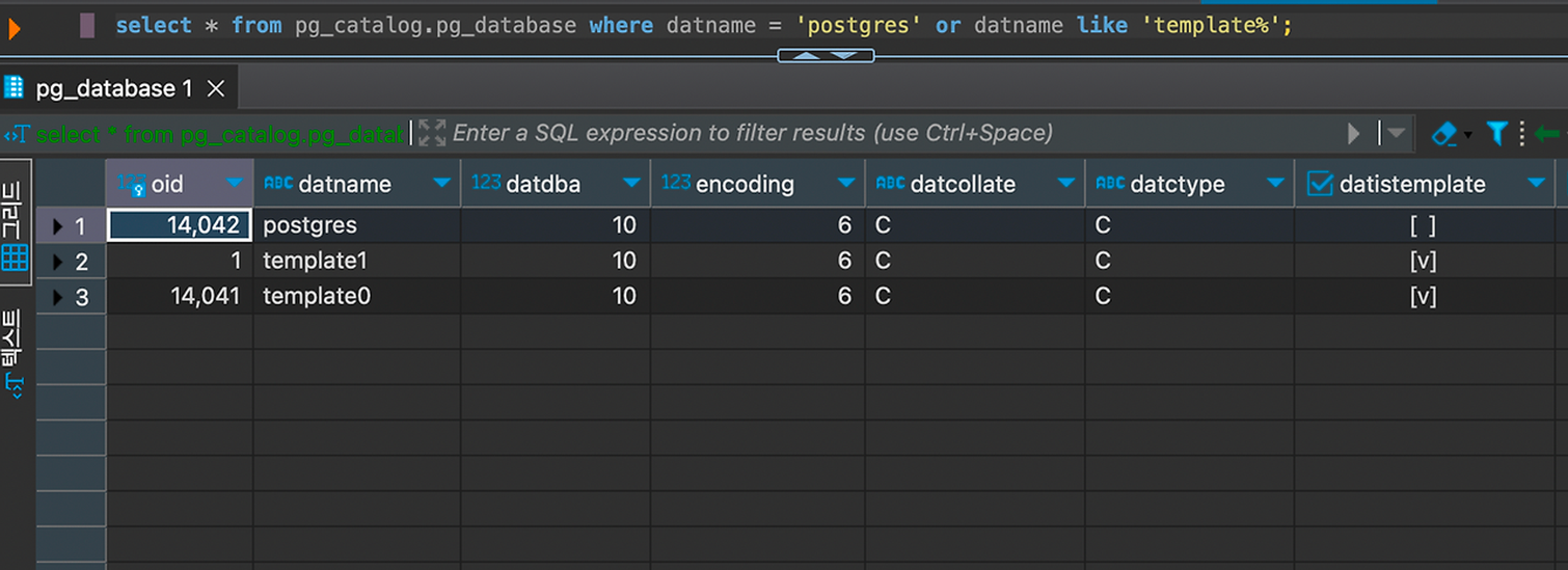 - template0과 template1 DB는 사용자 DB 생성을 위한 템플릿 DB이며 시스템 카탈로그 table을 포함하고 있다