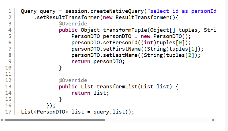 이전 Hibernate 구현에서는 단순히 Object[] 배열 자체를 다루며 transformTuple에서 필요한 부분만 추출했지만,