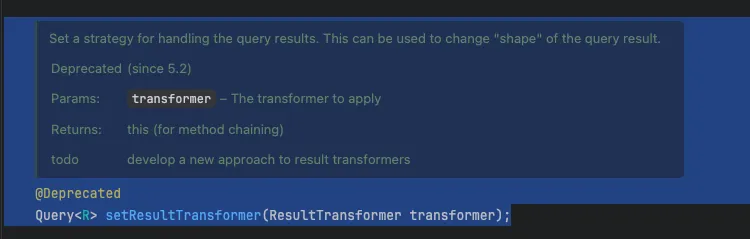 그래서 문서를 좀 봤어요. Criteria는 Deprecated 이런 것도 없고 setResultTransformer에는 이렇게 되어있네요