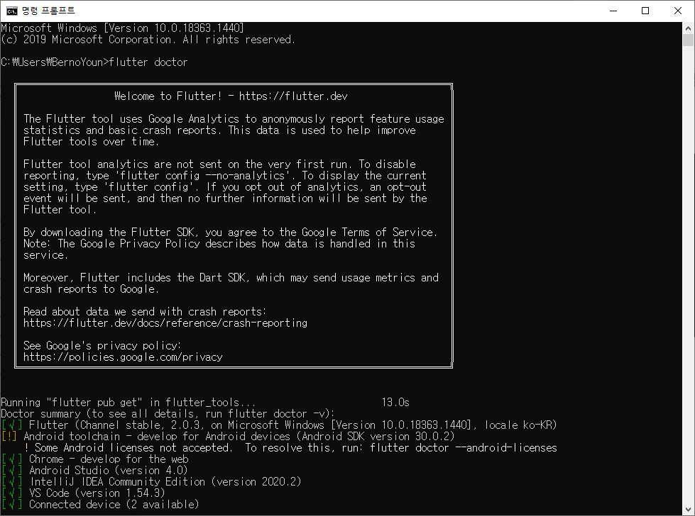해결책까지 잘 적혀있습니다. flutter doctor --android-licenses를 입력한 후 나오는 질문에 다 y를 누르고 진행하면 끝납니다.