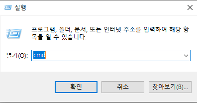 - 위 와 같은 창이 나왔다면 아래와 같이 cmd를 입력하고 확인버튼을 누릅니다.