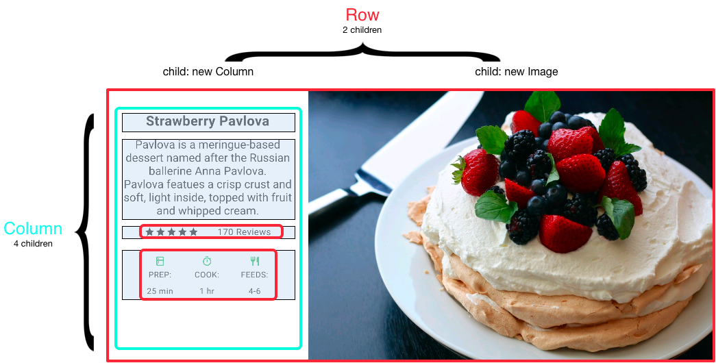 아래 layout은 Row로 구성되어있다. row는 2개의 children을 가진다(왼쪽 column과 오른쪽 이미지 영역)